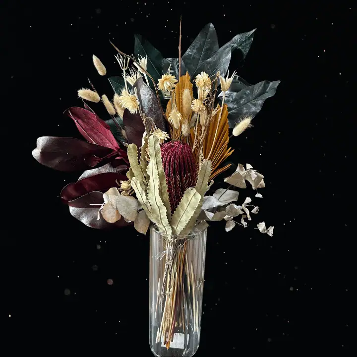 Meet Bush Disco — where Aussie wildflowers throw on their best and hit the spotlight! With pops of burgundy, golden fan palms, and a sassy banksia centre-stage, this preserved party knows how to strut. Set in a tall ribbed vase, it’s all about native flair with a cheeky twist. No dancing shoes required.