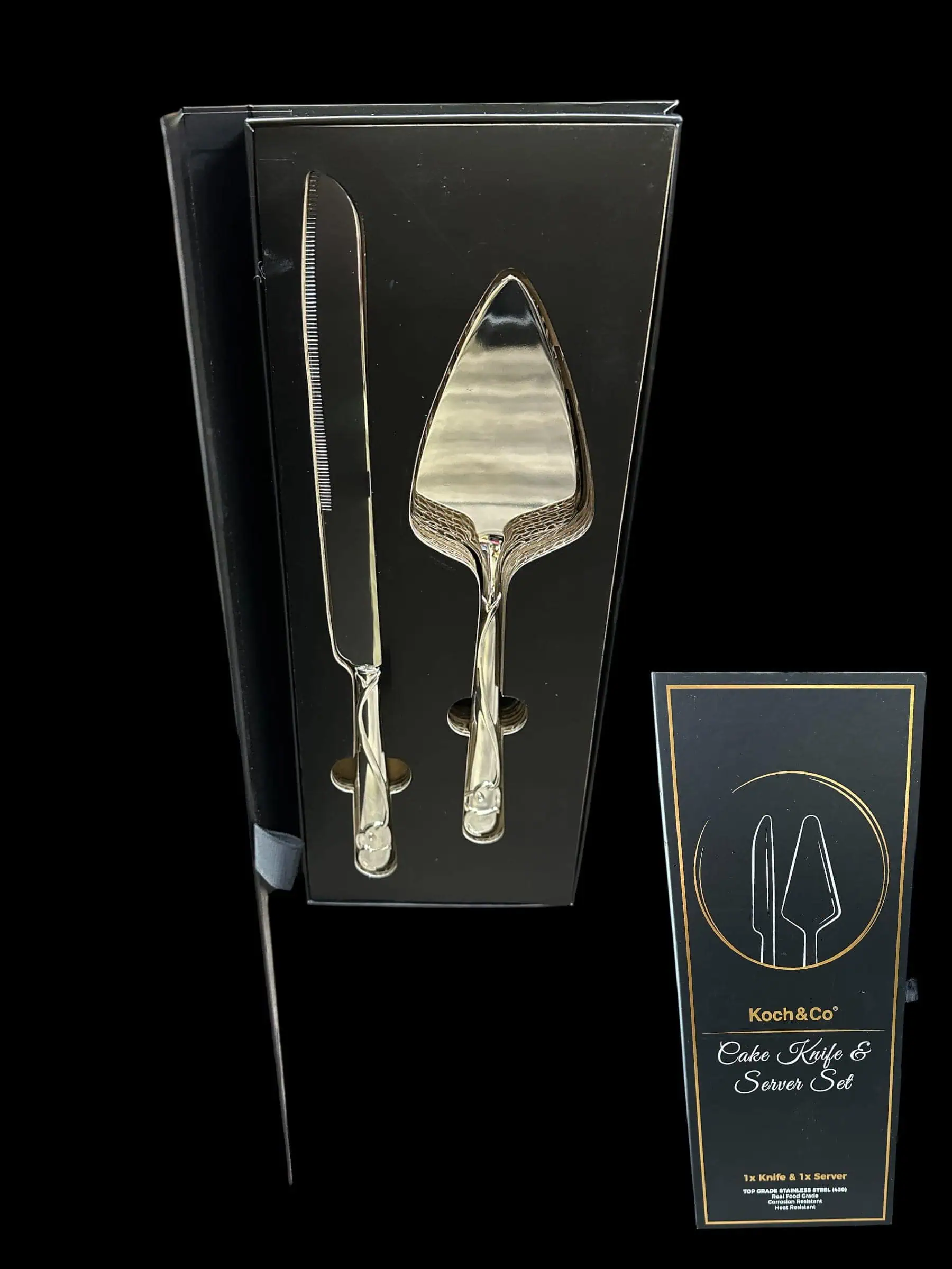 An elegant cake knife and server set, beautifully designed for special celebrations. Perfect for weddings, anniversaries, birthdays, or milestone events, this stylish set makes cutting and serving cake effortless and memorable. Presented in a sleek gift box, it also makes a thoughtful keepsake or gift for newlyweds and special occasions.