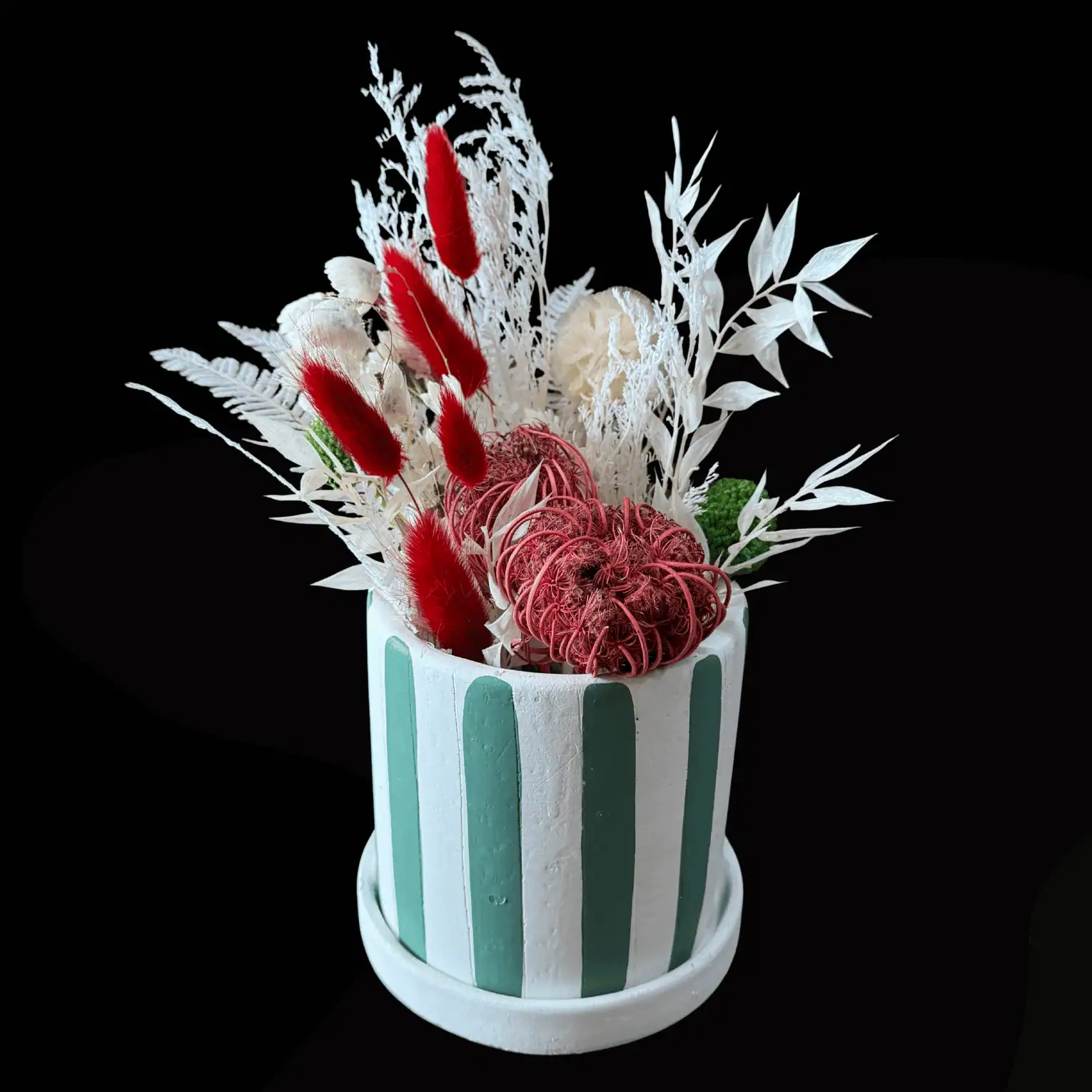 Bursting with bold reds, golden palms and festive pops of colour, Christmas Spark is a dried and preserved arrangement that brings instant holiday cheer. With its glowing tones and dramatic textures, it’s the perfect centrepiece to light up your home for the season — vibrant, joyful, and full of that magical Christmas sparkle.