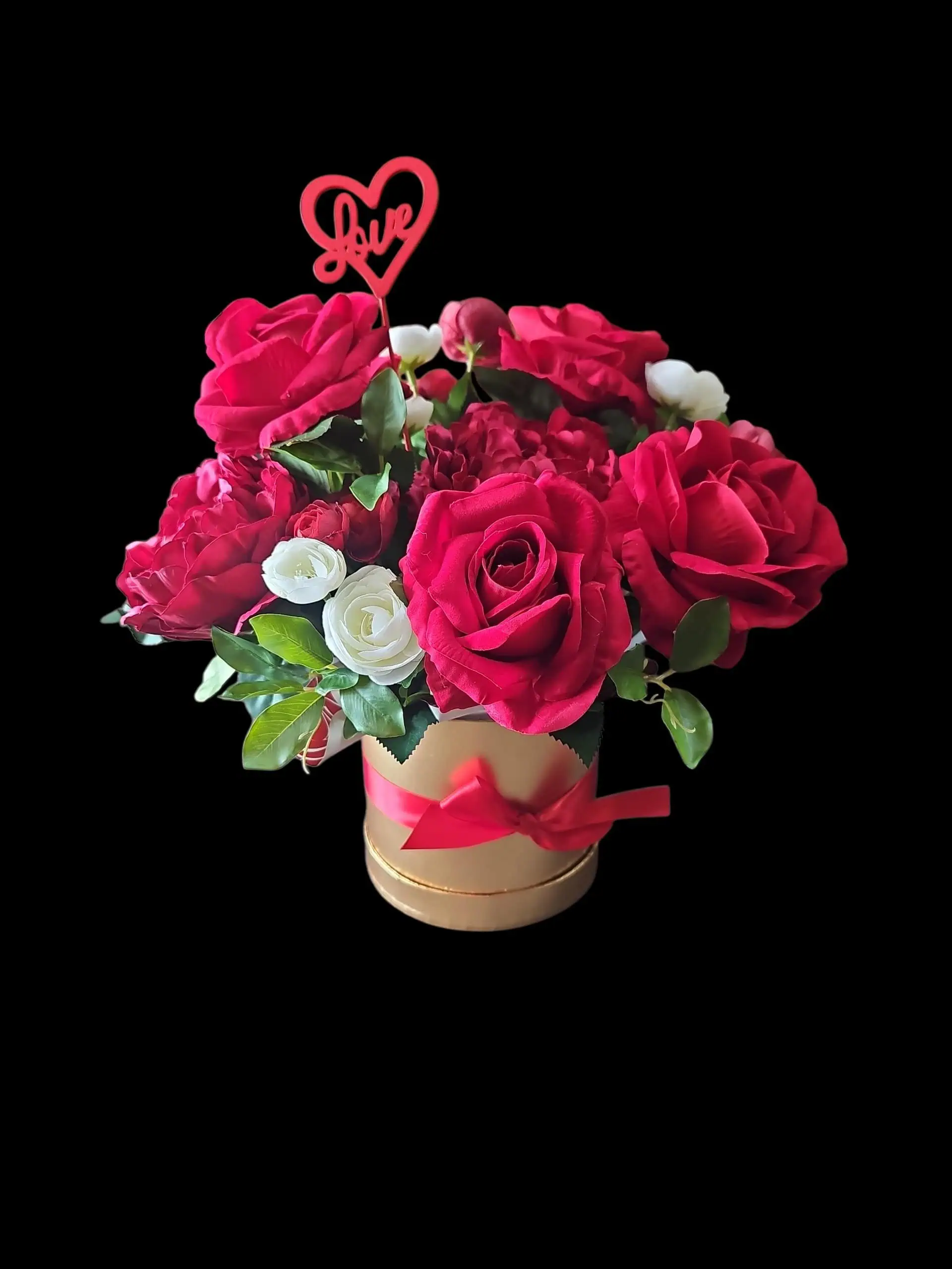 Featuring rich crimson roses, beautifully layered with lush greenery and finished in an elegant hat box with a satin ribbon and “love” topper, this arrangement delivers timeless elegance and heartfelt impact. Perfect for gifting, styling a bedroom or living space, or surprising someone special with flowers that stay beautiful forever.