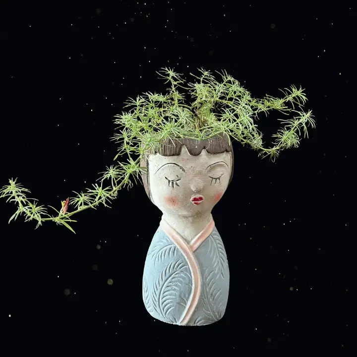 Sarah has created a wayward Geisha Girl with Red Flash Lotus for hair, actually looks like pig tails. A Red Flash is trailing plant known for its soft, silvery-grey foliage and bright, scarlet-red, parrot beak-shaped flowers that bloom in spring and summer.