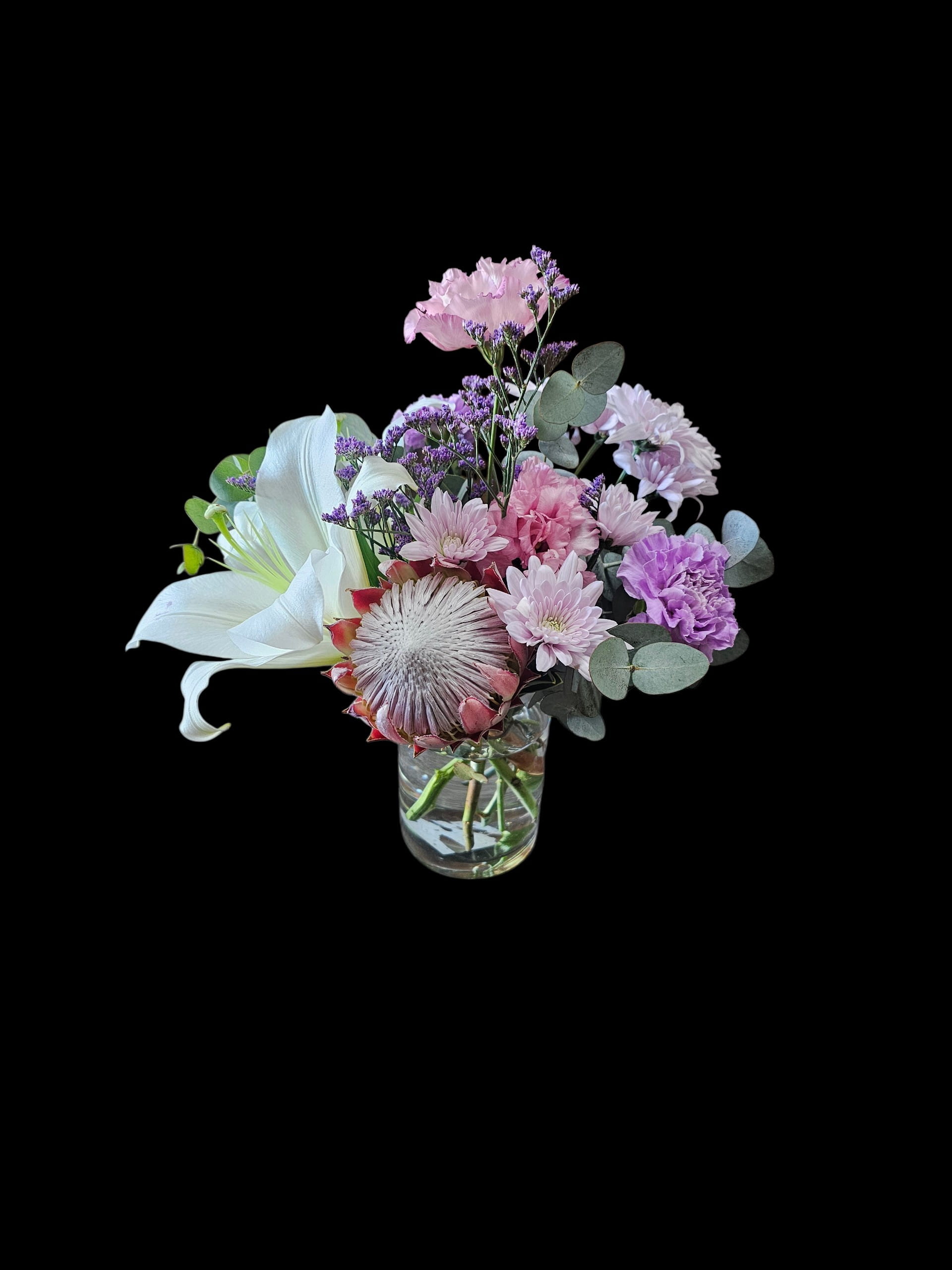 A soft and elegant arrangement of seasonal blooms in delicate pinks, lilacs, and creamy whites, including vase. Petal Whisper brings a gentle touch of beauty to any space. Featuring a striking king protea paired with lilies and textured florals, this design is perfect for thoughtful gifting or a quiet moment of indulgence.