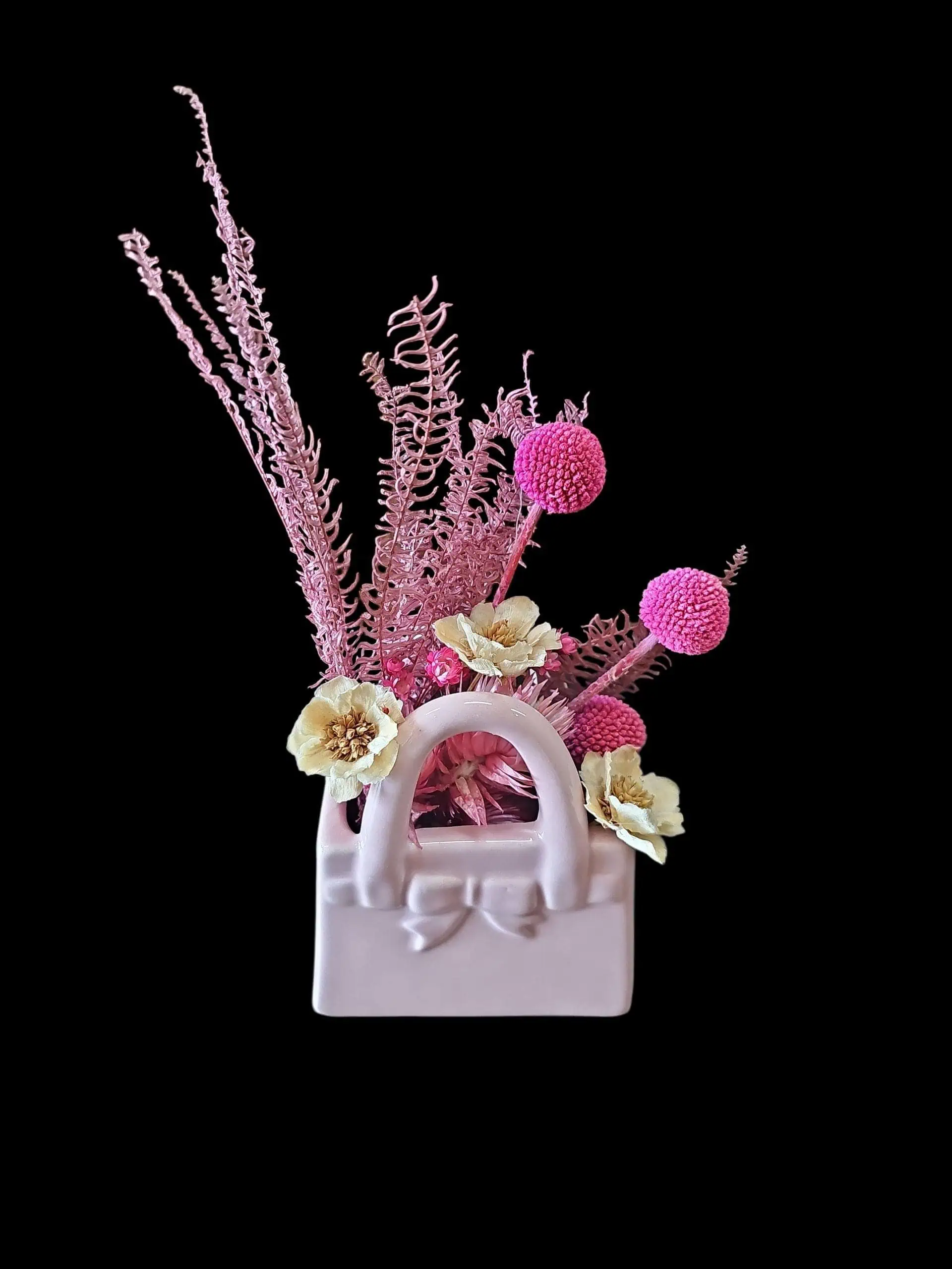 Pink Promise is a joyful dried and preserved arrangement designed to bring colour, texture, and long-lasting beauty into any space. Featuring playful pink tones paired with soft neutral blooms and sculptural foliage, this arrangement is styled in a charming handbag-style ceramic vessel for a modern, feminine finish.