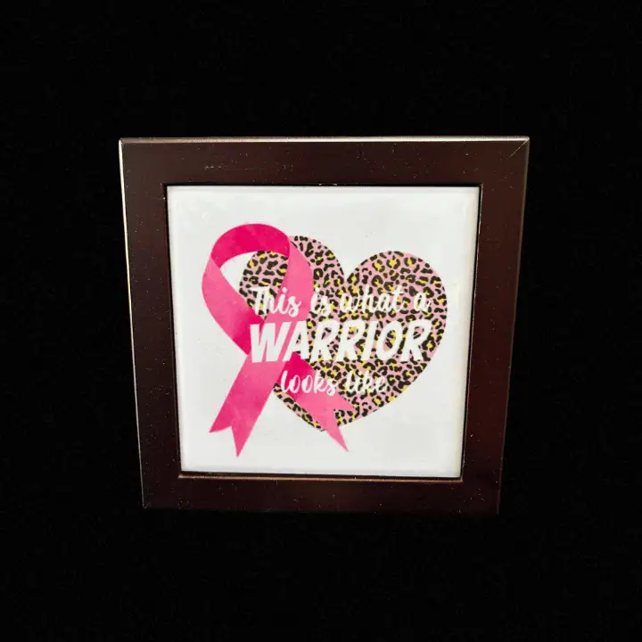 Bold, fierce, and full of strength — this framed tile showcases a leopard-print heart, pink ribbon, and the powerful words “This is what a Warrior looks like.” A striking tribute to courage, resilience, and the fight against breast cancer. Display it with pride as a reminder of hope and unstoppable spirit. This tile has been locally created and is freestanding or can lay flat.